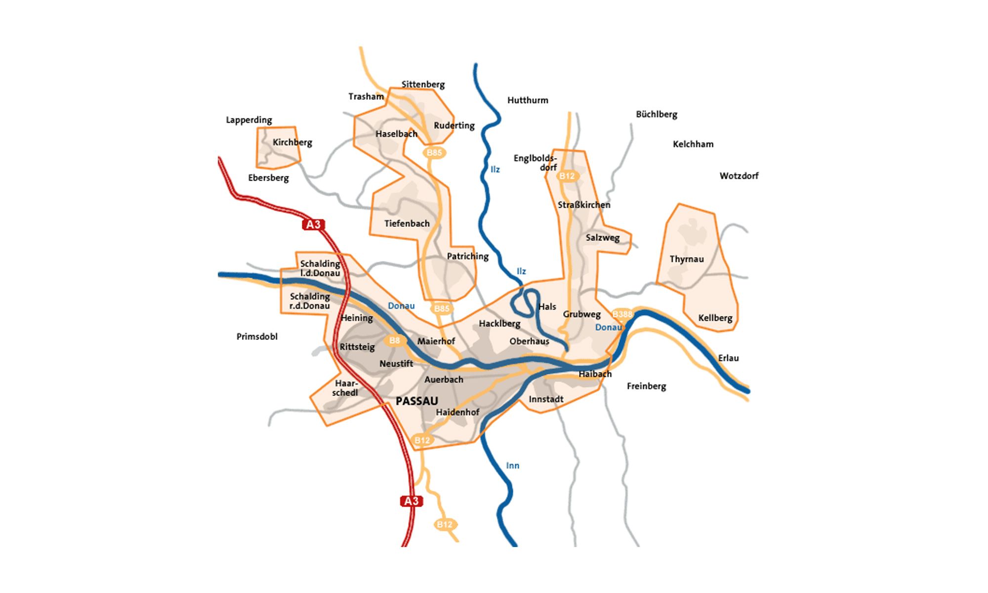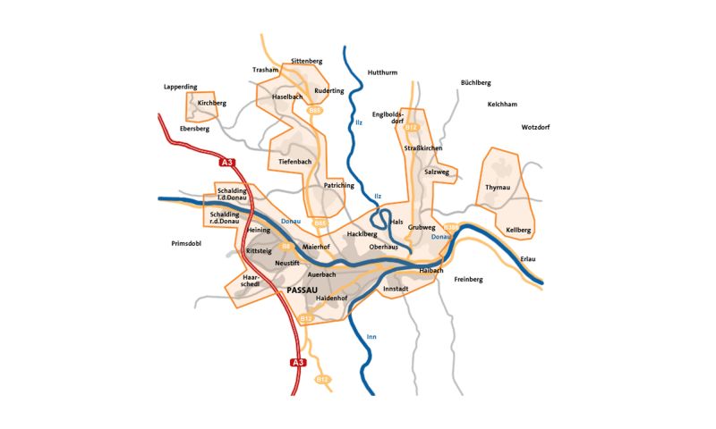 Die Stadtwerke Passau GmbH betreibt ein Verteilnetz der Gasversorgung in folgenden Bereichen: